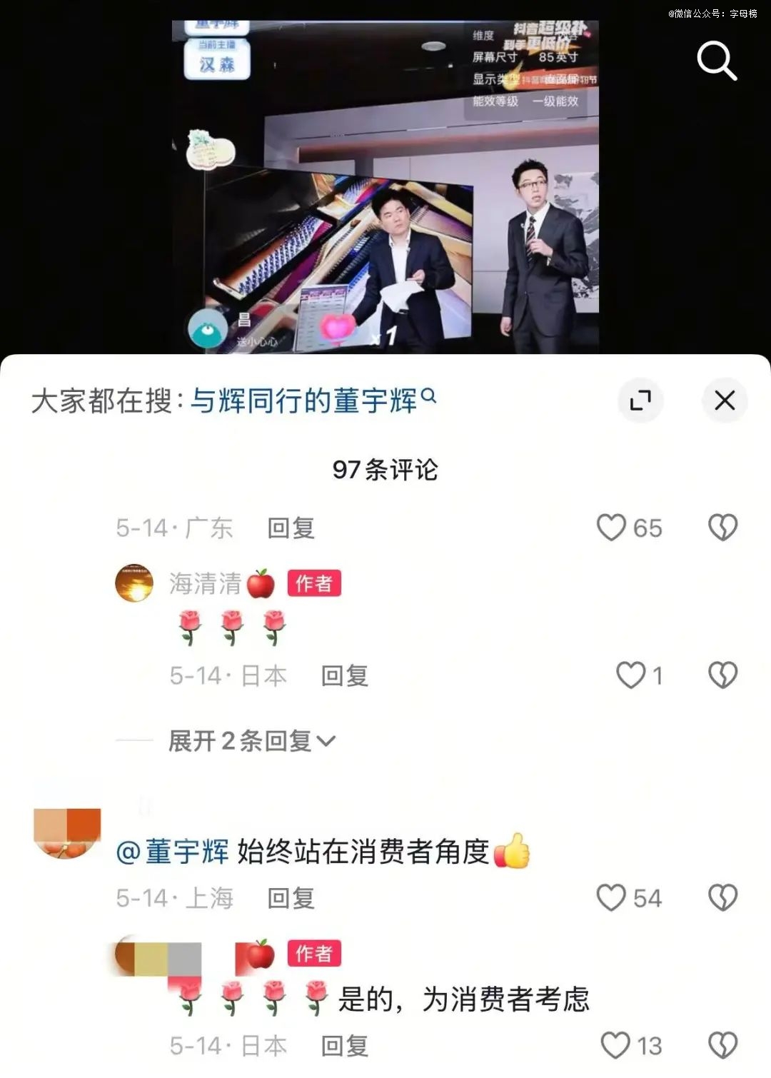 这个谈判片段在董宇辉的粉丝群体中广为流传。在他们眼里,董宇辉是站在消费的人的立场上和厂家据理力争,不少粉丝都表示“宇辉真心为广大购买的人着想”“确实牛啊,现场谈判”“现场和商家杠的只有董宇辉”。